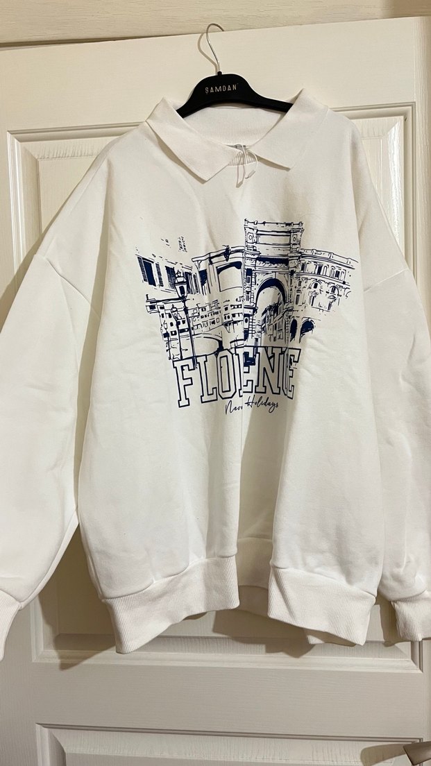 Pamuklu, bol kesim, uzun kollu beyaz sweatshirt. Paris sokak stilini yansıtan baskılı tasarımı ve midi boy uzunluğu ile günlük kullanıma uygun. Hiç giyilmedi dokusu çok güzel M/L beden