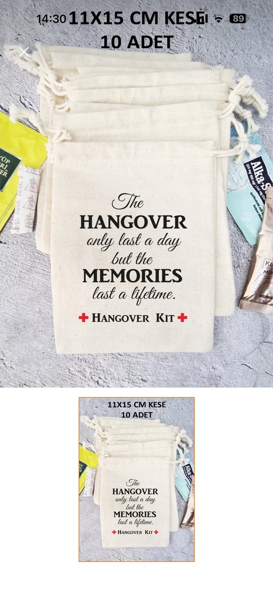 11x15 cm ölçüsünde beyaz pamuklu, baskılı ve bağcıklı 10 adet kese. Üzerinde hangover ve memories temalı yazılar bulunur. ️