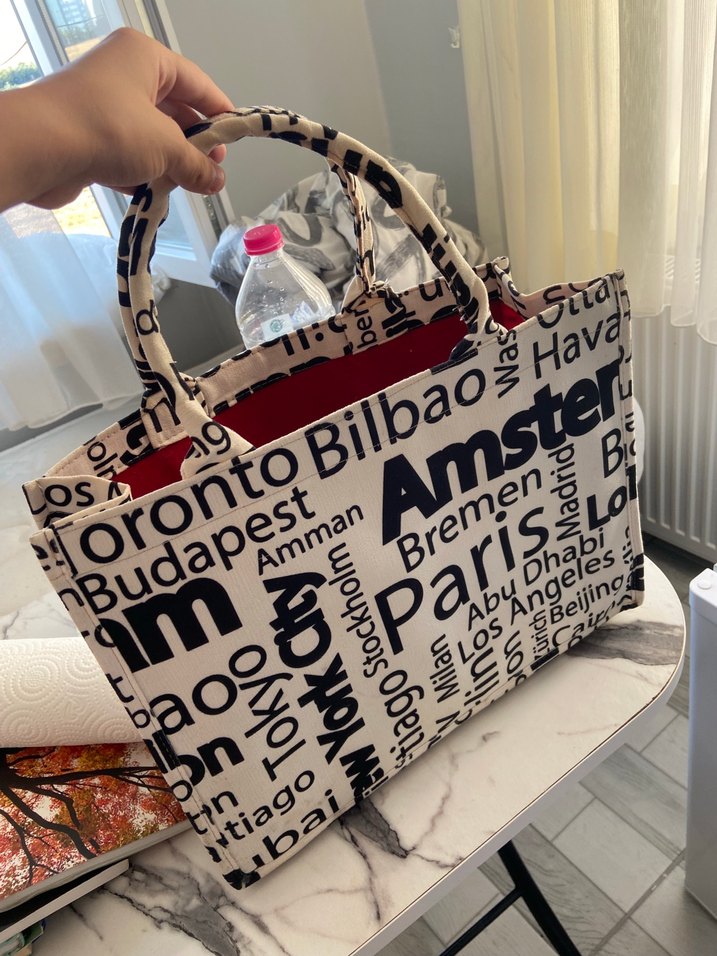 Baskılı beyaz ve gri renklerde, şehir isimleriyle süslenmiş plaj çantası ( az kullanıldığı için yan duvarları biraz hafif bükülmüş gibi ama içi dolunca belli bile olmuyor )