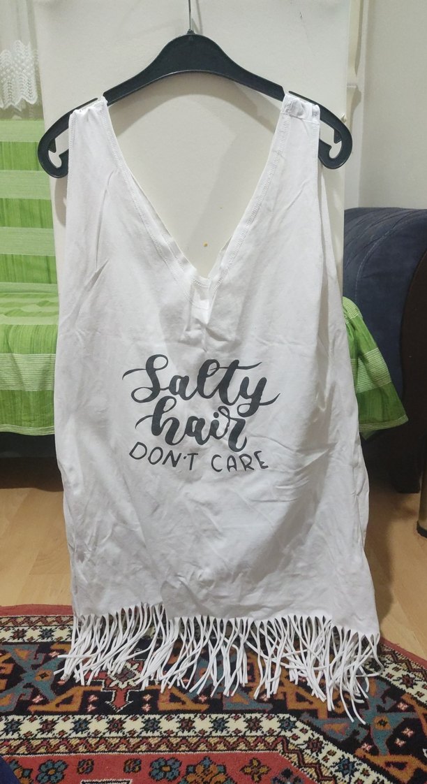 Beyaz plaj elbisesi , siyah renkli 'Salty hair, don't care' baskılı yazı ve alt kısmında püskül detayları bulunur. Rahat kesim ve derin yaka.
