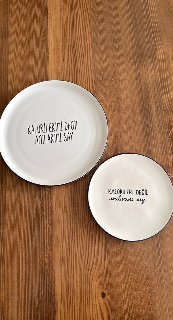 Beyaz tabak seti, üzerinde "Kalorilerini değil anılarını say" yazısı bulunan sade ve geleneksel tasarım. ️#lcwhome