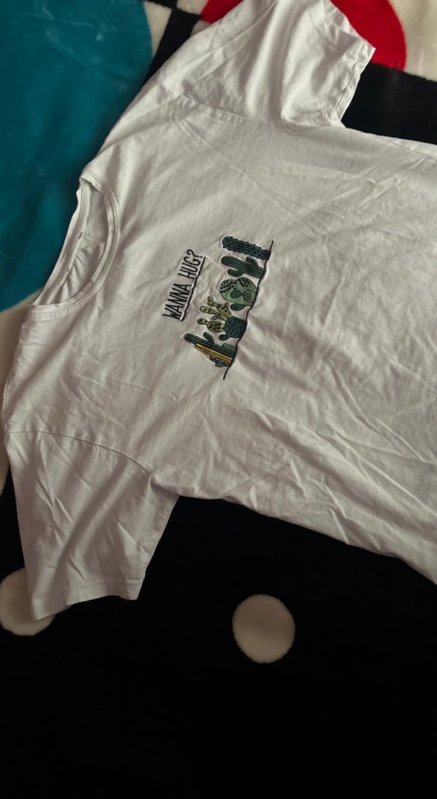 Pamuklu, kısa kollu, beyaz tişört. Baskılı kaktüs ve "Wanna Hug?" yazısı ile rahat ve salaş kesim, günlük dış mekan kullanımı için uygundur.