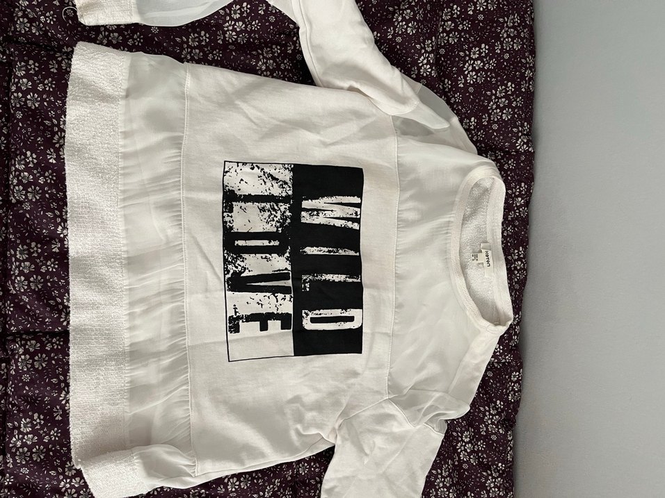 Pamuk kumaştan, kısa kollu ve rahat kesimli beyaz tişört Önünde siyah ve gri baskılı grafik ve yuvarlak yaka bulunur.