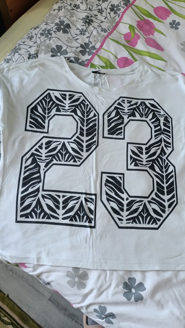 Pamuklu, kısa kollu, yuvarlak yaka beyaz gri baskılı 23 numara ile günlük kullanıma uygun rahat kesim.