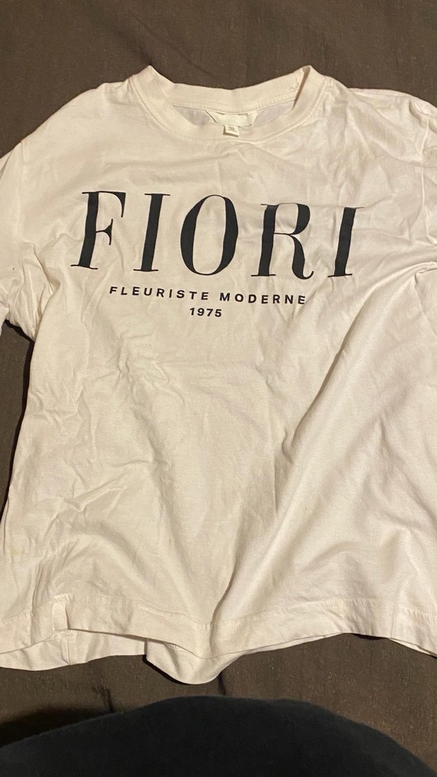 Beyaz pamuk hamile tişörtü, bol kesim ve kısa kollu. Yuvarlak yaka ve 'FIORI FLEURISTE MODERNE 1975' baskılı. Günlük sokak stiline uygun.