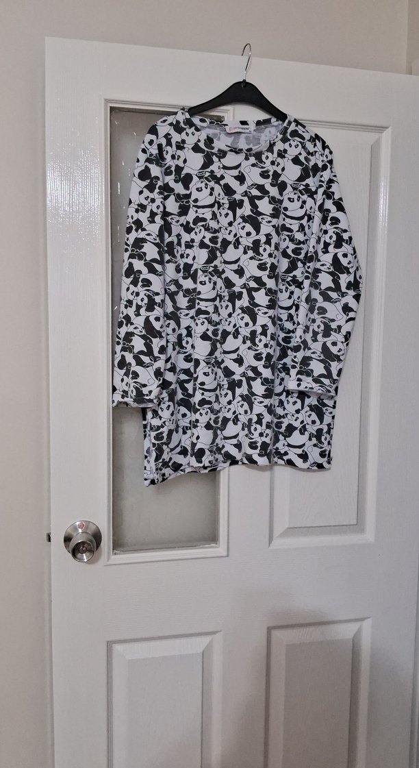Yumuşak pamuk kumaştan, uzun kollu ve bisiklet yaka, bol kesim beyaz hamile tişörtü. Üzerinde gri baskılı desen bulunur, rahat sokak stili için uygun.