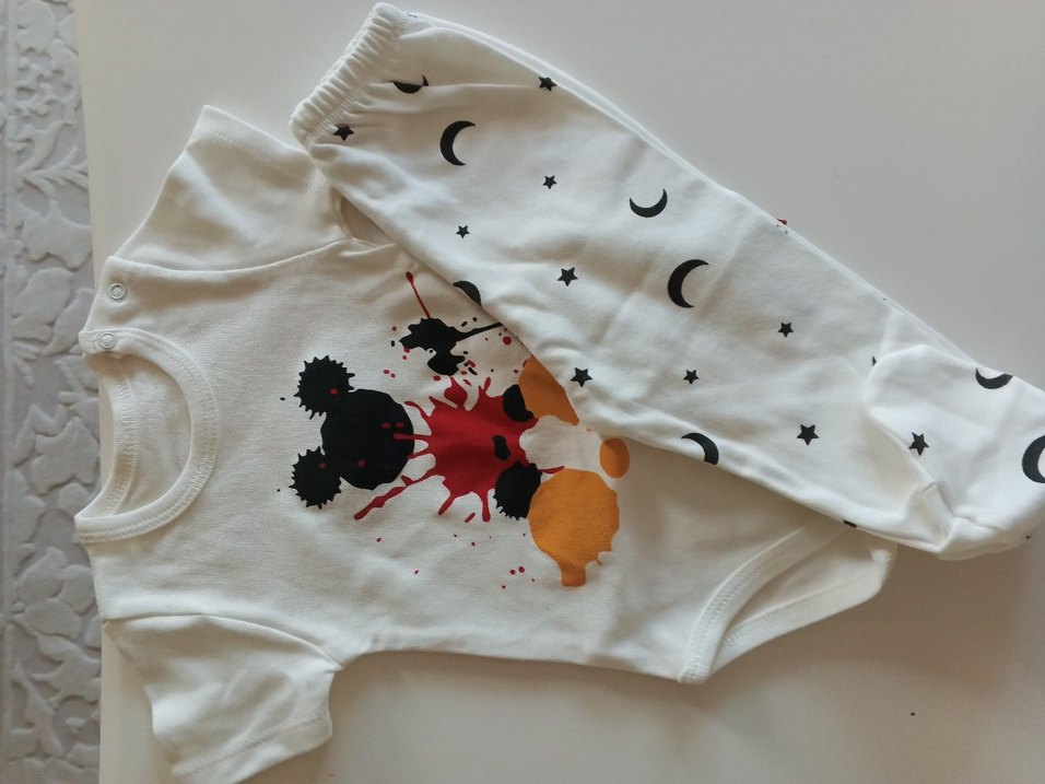 Pamuklu, baskılı, beyaz uzun kollu bebek body. Yuvarlak yakalı ve pop kültür temalı desenlere sahip.