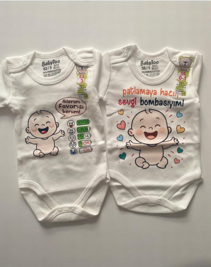 Rahat ve yumuşak kumaştan, baskılı sevimli bebek desenli beyaz uzun kollu bebek bodyler.