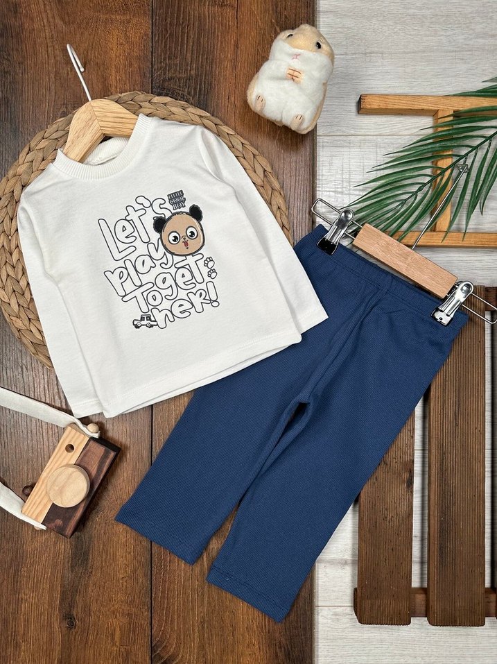 Pamuklu beyaz uzun kollu tişört ve lacivert pantolonlu baskılı erkek bebek takımı, rahat ve şık bir sokak stili sunar.