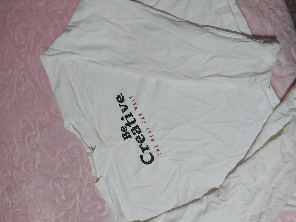Pamuklu, beyaz uzun kollu kız tişörtü, bol kesim ve yuvarlak yaka. "Be Creative" baskılı tasarıma sahiptir.