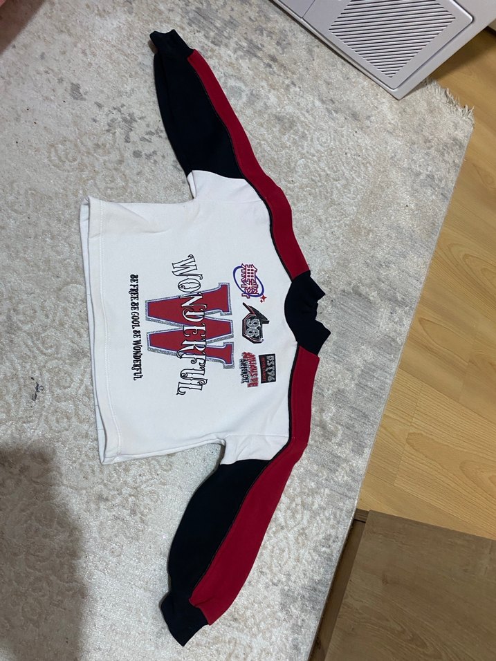 Beyaz, uzun kollu ve fitted kesim sweatshirt, kırmızı ve siyah örme detaylara sahiptir. Önünde "WONDERFUL" baskısı bulunan sportif ve trend görünümlü bir üründür. ♀️