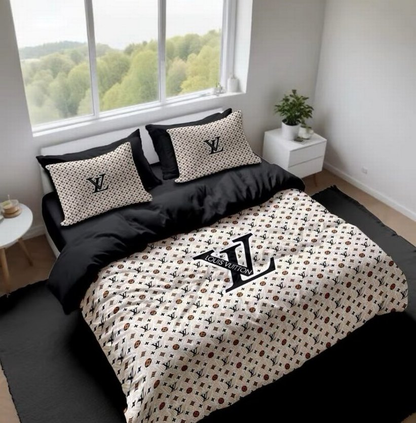 Baskılı beyaz ve siyah renklerde, büyük logolu nevresim ve uyumlu yastık kılıflarından oluşan koyu desenli set. ️