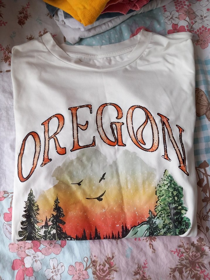 Pamuk kumaştan yapılmış, baskılı "OREGON" yazılı, kısa kollu ve bol kesim beyaz tişörtü. Doğa temalı tasarımıyla açık hava için uygun. Temudan almıştım.