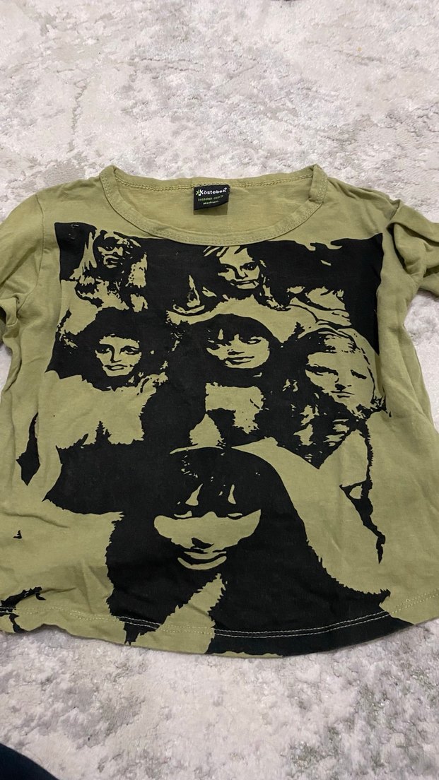 Khaki renkli, rahat kesim, uzun kollu kız tişörtü. Yuvarlak yaka ve siyah baskı detaylı, yumuşak keten kumaştan üretilmiştir.