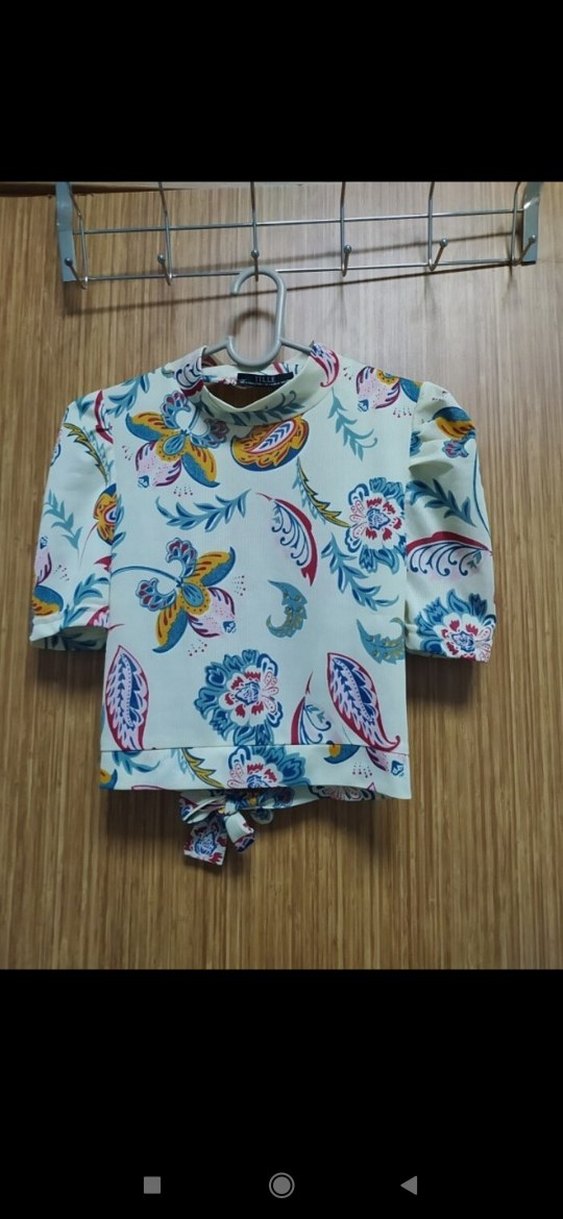 Sentetik kumaştan, bohem pastel çok renkli baskılı, düğmeli, kısa kollu, balıkçı yakalı, bol kesim mini bluz.