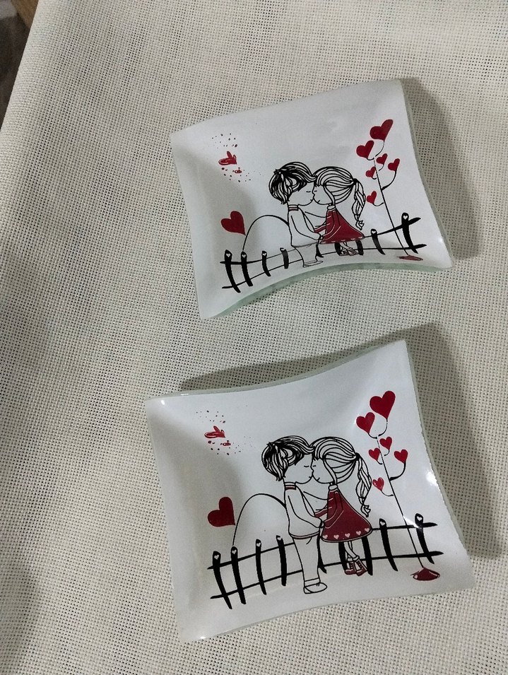 Beyaz renkli, üzerinde çocuk ve kalp desenleri bulunan baskılı cam servıslık ıkılı ve teklı satıs olur