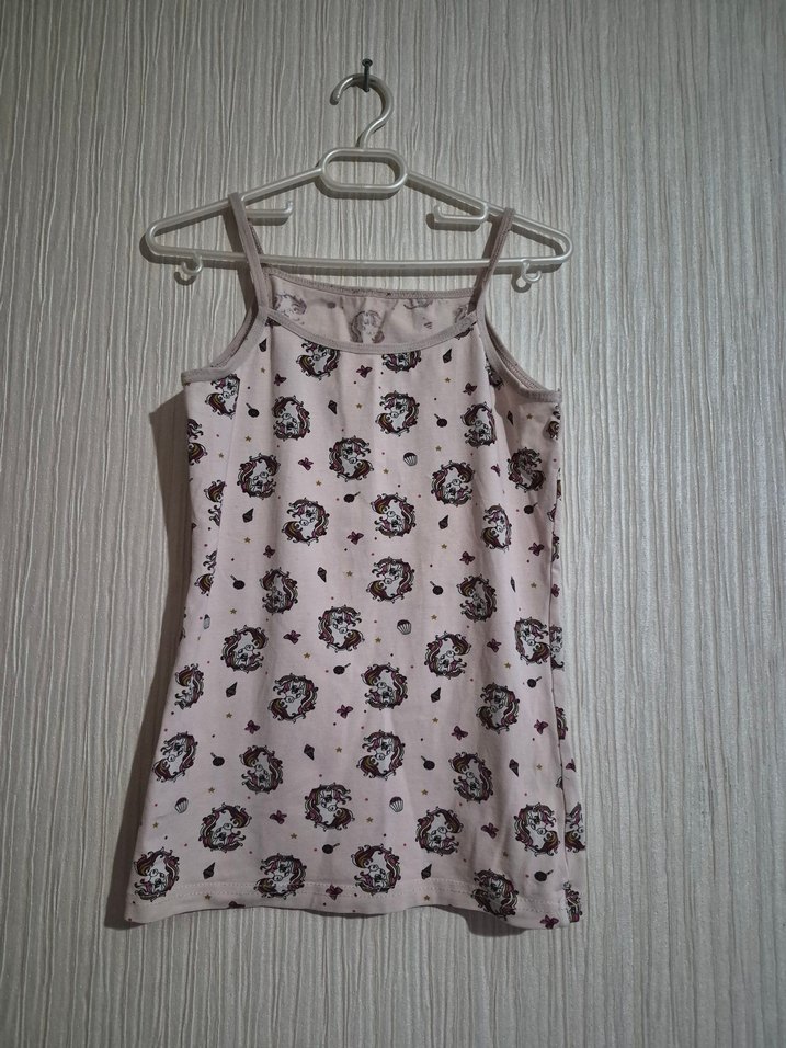 Pastel renkli baskılı unicorn ve küçük desenler içeren bej çocuk atlet, ince askılıdır.