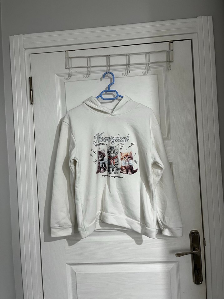Beyaz renginde, uzun kollu ve bisiklet yaka olan bu sweatshirt, rahat kesimi ve yumuşak sıcak kumaşı ile dikkat çeker. Üzerinde müzikle oynayan kediler baskısı vardır, günlük kullanıma uygundur.
