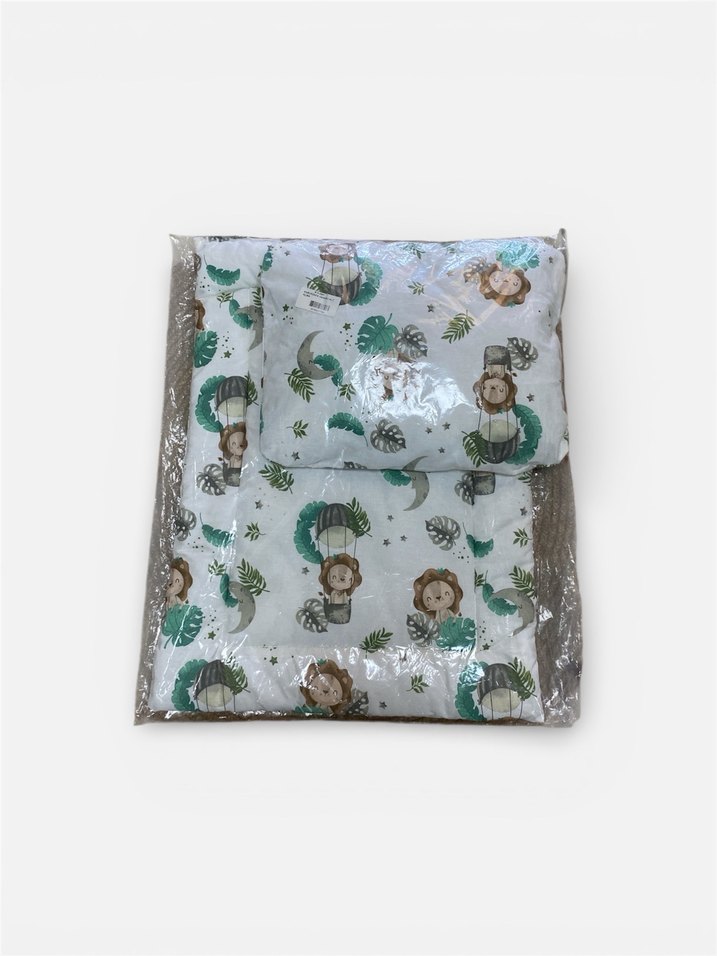 Baskılı desenlere sahip, gri ve kahverengi tonlarda yumuşak sentetik kumaştan yapılmış çocuk uyku seti. Yastık ve battaniye içerir.
