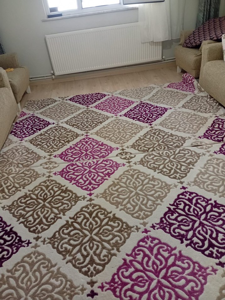 Bej, mor ve kahverengi tonlarında baskılı desenlere sahip çok renkli, konvansiyonel tarzda bir halı.Uzunluğu 2.70 genişliği 1.90 2 tanedir
