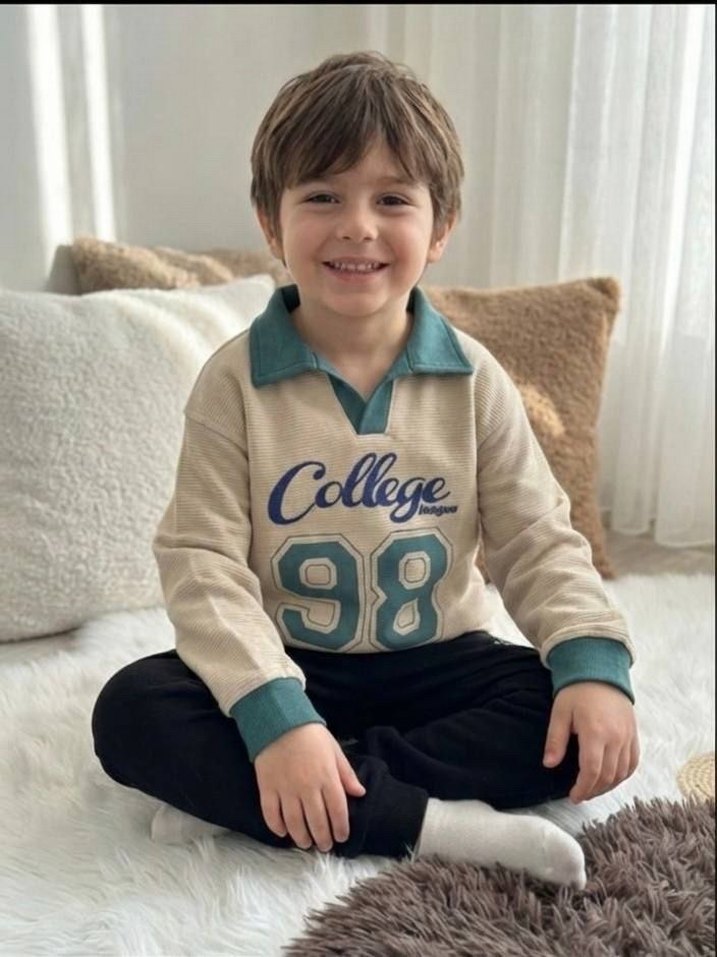 Bol kesim, yakalı ve kabarık kollu sweatshirt, gri ve kahverengi tonlarda 'College 98' baskılı. Siyah eşofmanla tamamlanmış, trendi ve rahat bir tarz sunar. 13/14 yaş sürat kargo