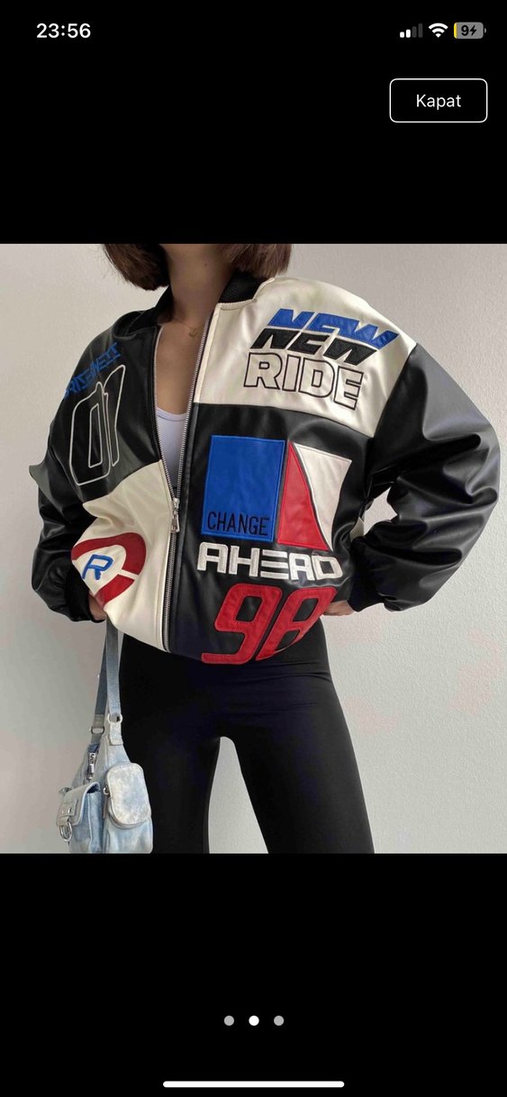 deri ceket, bisiklet yaka ve fermuarlı. Siyah-beyaz baskılı paneller ve bol kesimle rock punk havası verir. Sorunu yoktur.S-m olur