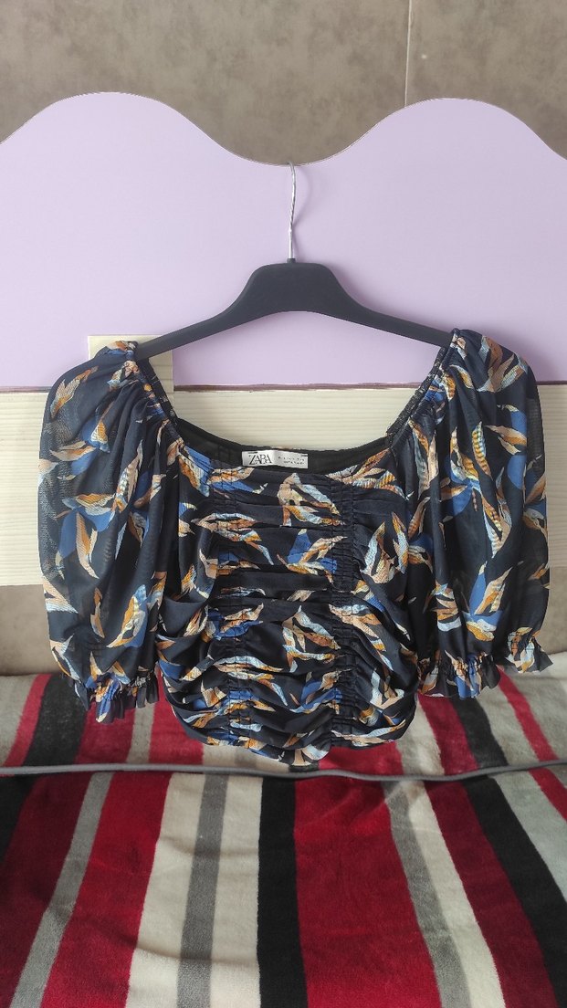 Straplez yaka, drapeli tasarımlı, baskılı ve sentetik kumaşlı bol kesim mini bluz. Bohem tarzı için uygun günlük sokak giyimi. Hediye geldi denemek için kullanıldı sadece hiç giyilmedi .