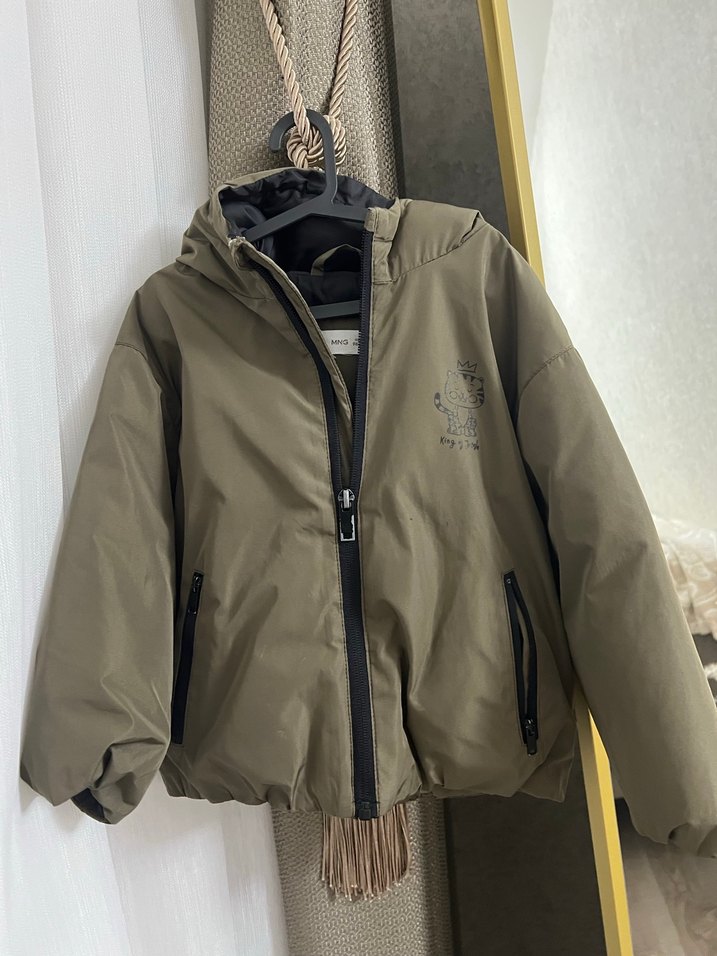 Baskılı, geniş kesim ve kemerli erkek çocuk montu. Fermuarlı cepler ve kahverengi-yeşil tonlarında yumuşak, sıcak kumaş içerir.
