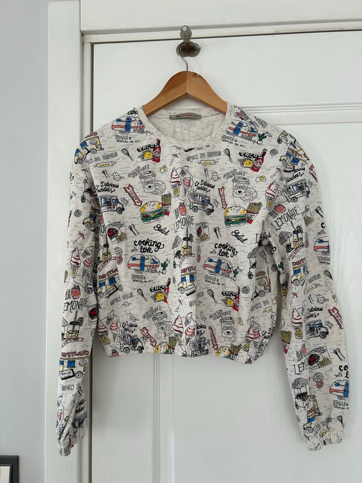 Pamuk kumaştan, bol kesim, uzun kollu ve yuvarlak yakalı gri baskılı düğmeli kadın sweatshirt. Fotoğraflarda görüldüğü gibi herhangi bir sorunu yoktur