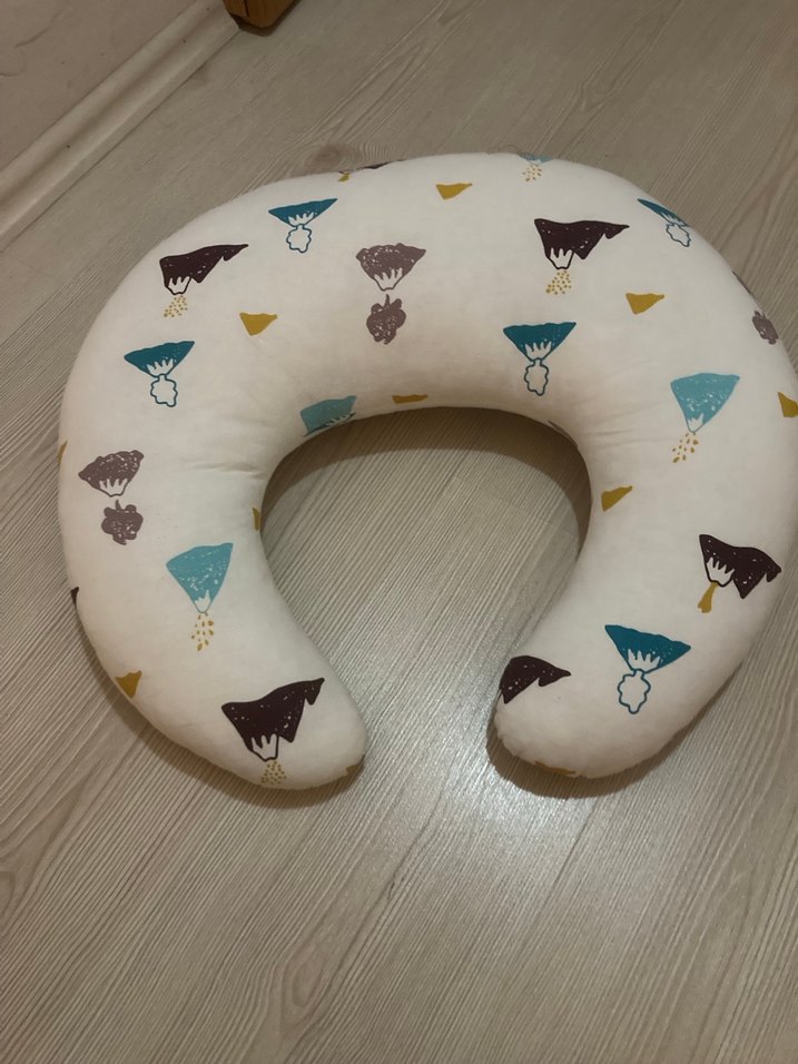 Beyaz zemin üzerine pastel renklerde baskılı desenlere sahip hamilelik ve emzirme yastığı, konfor ve destek sağlar. Hiç bir deformesi yoktur