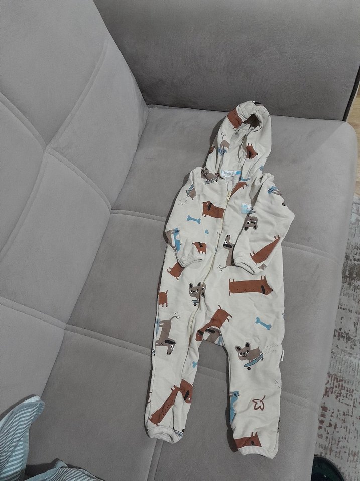 Gri ve kahverengi tonlarında, baskılı desene sahip, kapüşonunda kürk detaylı yumuşak ve sıcak kumaştan erkek bebek tulumu.