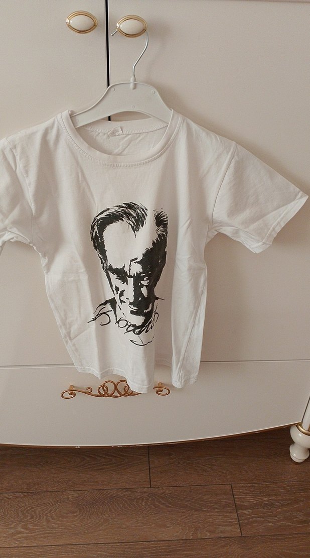 Pamuk, kısa kollu, yuvarlak yaka, bol kesim beyaz tişört, koyu baskılı taş ve rock punk havası taşır.