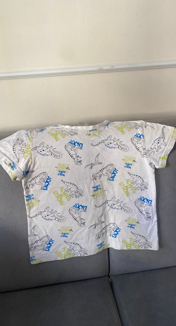 Pamuk kumaştan, bol kesim kısa kollu erkek çocuk tişörtü. Beyaz zemin üzerinde mavi ve yeşil baskılı dinozor ve yazı desenleri içerir.