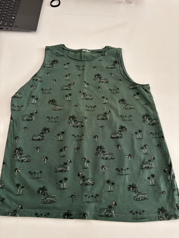 Yeşil renkli, kolsuz, baskılı erkek çocuk tişörtü. Yuvarlak yaka ve bol kesim, yumuşak dokulu kumaştan, bohem ve retro tarzda.