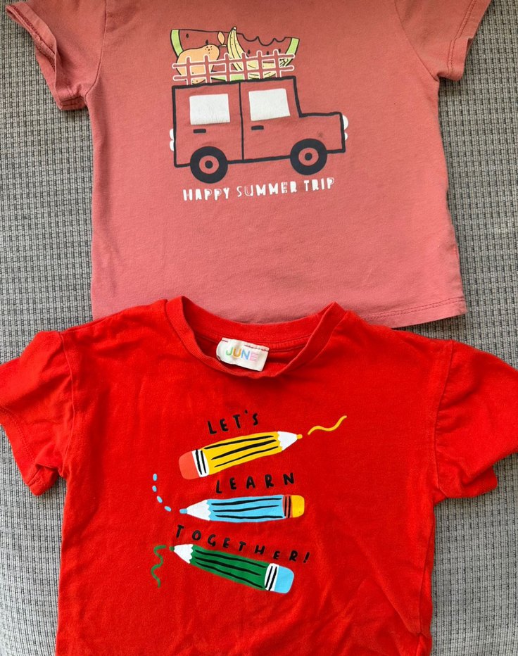 Pamuk kumaştan üretilmiş, kısa kollu ve bisiklet yaka kırmızı erkek çocuk tişörtü. Renkli baskılar ve eğlenceli temalar içerir, üzerinde 'HAPPY SUMMER TRIP' ve 'LET'S LEARN TOGETHER' yazıları bulunur. Üstteki lc Waikiki 18-24 ay . Kırmızı olan june marka 2 yaş .üsttekinde bir kaç minik lekeleri var