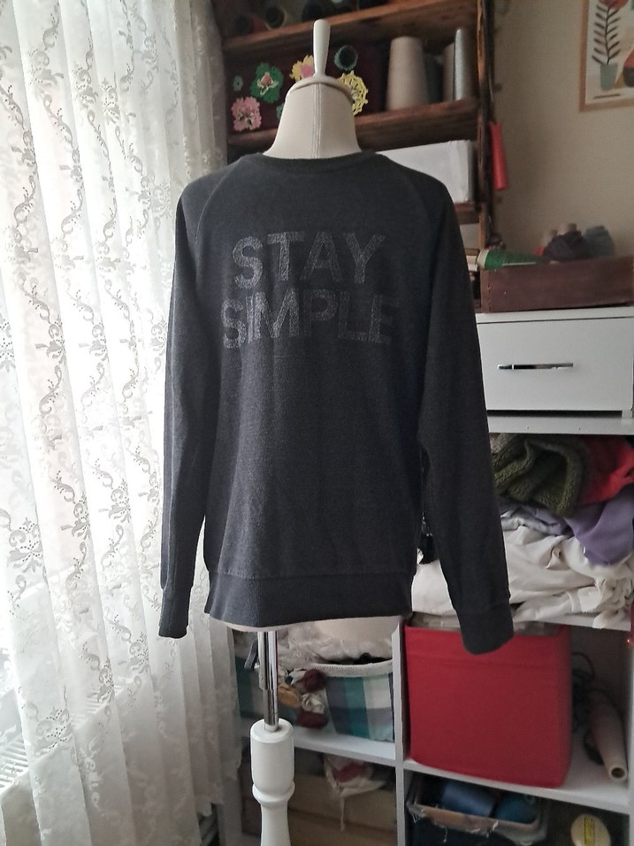 , "STAY SIMPLE" baskılı, uzun kollu, rahat kesim ve örgü dokulu erkek sweatshirtü.
