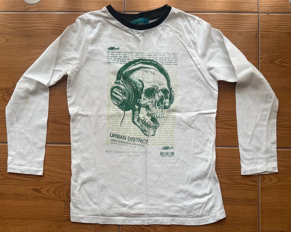 Pamuk kumaştan, bol kesim, kısa kollu ve bisiklet yaka erkek tişörtü. Beyaz zemin üzerinde kulaklıklı kafatası baskısı ve "URBANDISTRICT" yazısı bulunur. Hafif lekesi var fotoğrafta belirtildi