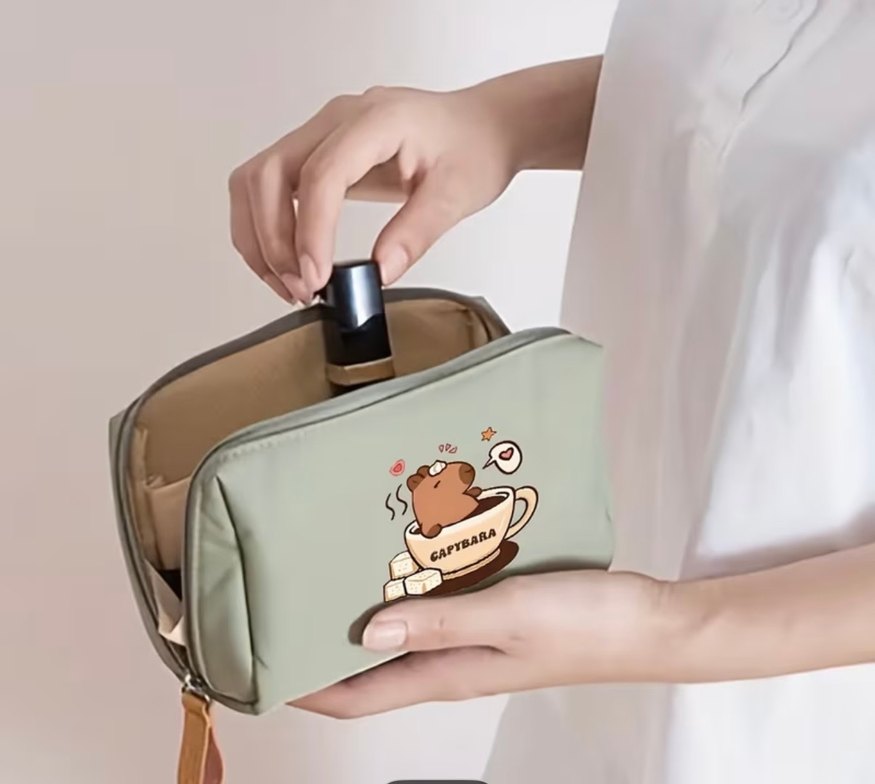 Pastel bej renkte, baskılı ve fermuarlı, sentetik kumaştan günlük kullanıma uygun makyaj çantası.