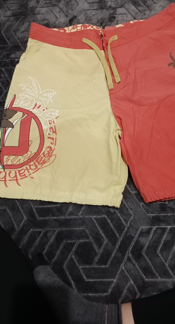 Kırmızı ve bej renklerde baskılı, fermuarlı cepli, bol kesim erkek deniz şortları, plaj ve günlük rahat stil için uygun. turuncu sarı renklerde