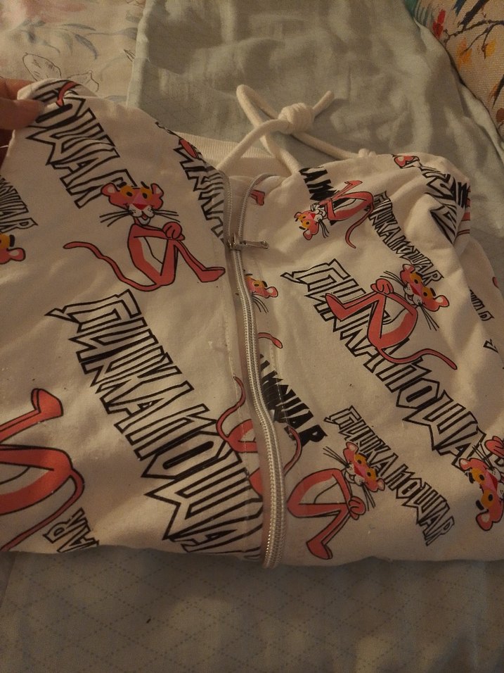 Beyaz ve açık renkli, fermuarlı ve baskılı sokak stili kedi kıyafeti. Kumaş üzerinde renkli çizgi film karakterleri bulunur.