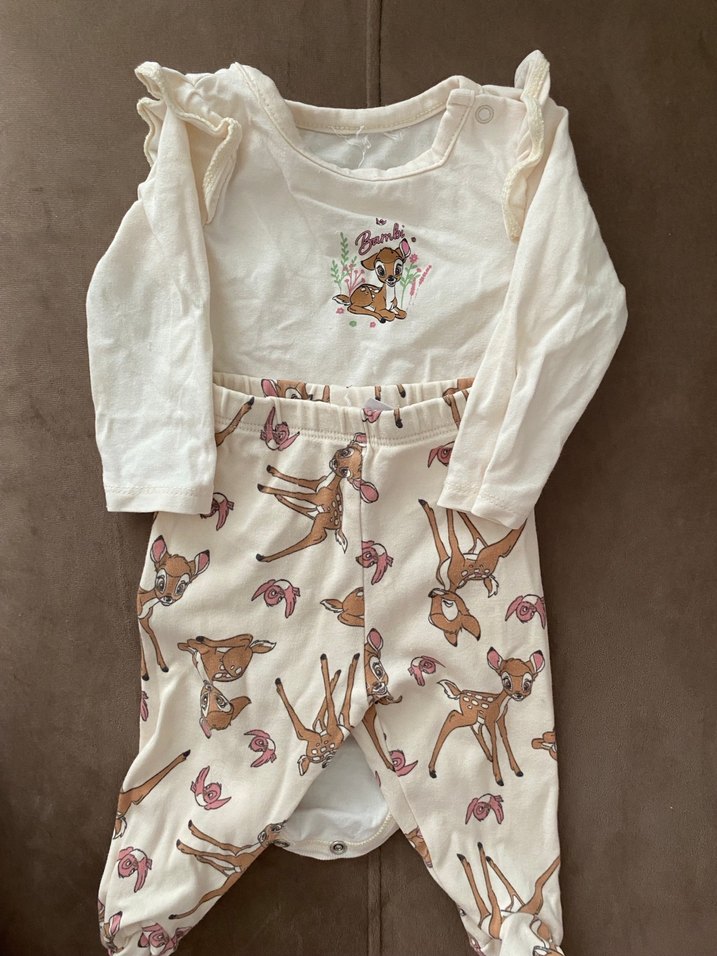 Uzun kollu ve fırfırlı detaylara sahip, yumuşak pastel beyaz renkte baskılı bebek kız takımı.