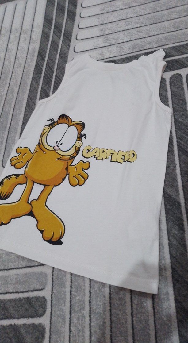 Baskılı Garfield figürü ve yazısı bulunan beyaz çocuk atleti. Rahat kullanım için yumuşak kumaştan yapılmıştır.