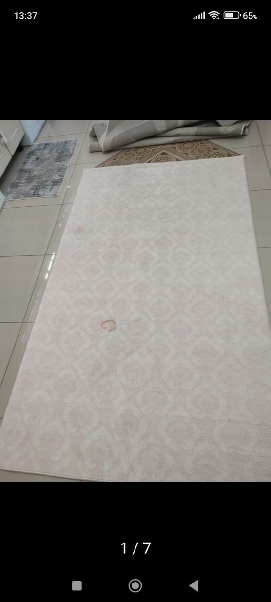 Beyaz ve pembe renginde, hafif tonlarda baskılı geleneksel desenli halı. Yumuşak bir dokunuş sağlar, Proplemli yerlerini cektim en 152 boy 255 cm