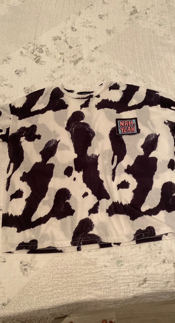 Beyaz tekstil kumaştan, kısa kollu ve yuvarlak yakalı bu tişört, siyah baskılı deseni ve "NAH YEAH" yazılı yamasıyla grunge punk stilini yansıtıyor. Rahat kesim ve günlük kullanım için uygun.