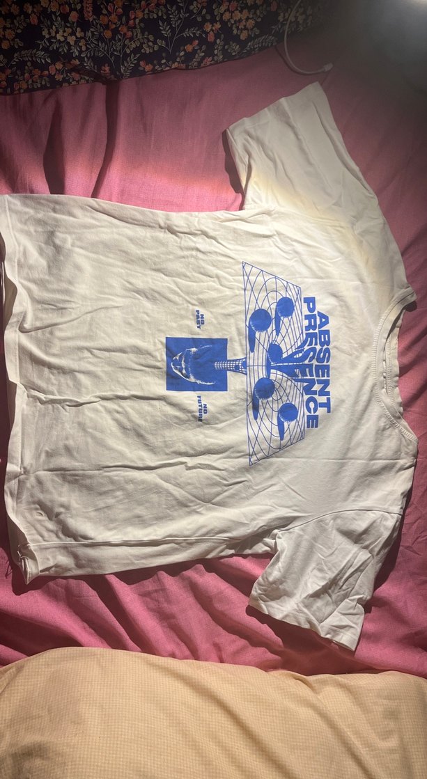 Kısa kollu, yuvarlak yaka, oversize tshirt. Pastel beyaz renkte, mavi baskılı grafik detaylı, defolu tshirt.