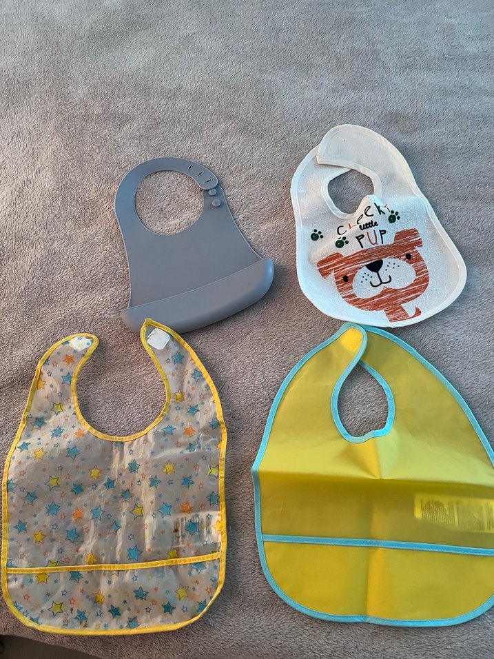 PUP yazılı ve sevimli hayvan baskılı gri bebek önlüğü, yumuşak ve kullanışlıdır.