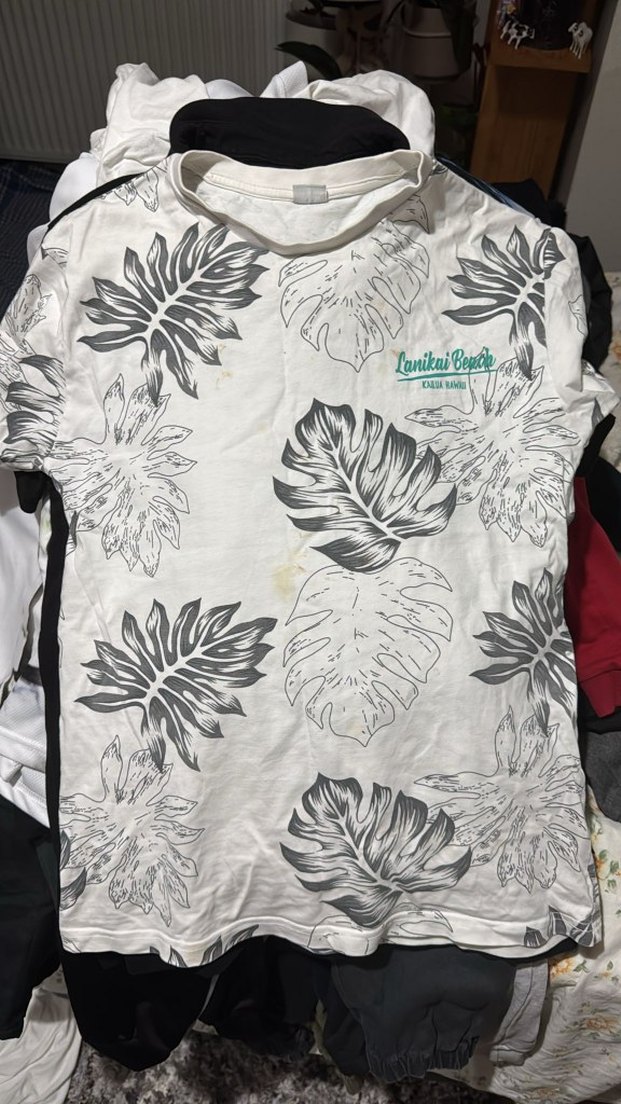Bu erkek tişörtü, bol kesim, kısa kollu ve yuvarlak yaka detayına sahiptir. Sentetik kumaştan üretilmiş, gri beyaz yaprak baskılı, streetwear tarzındadır. "Lanikai Beach" yazısı bulunmaktadır.