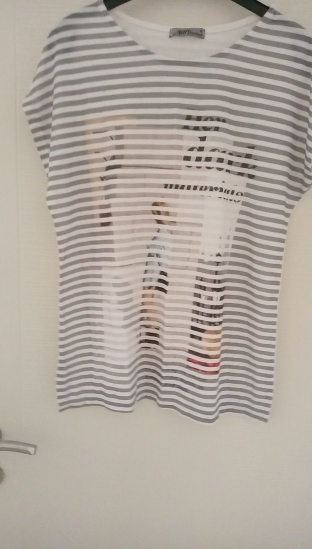 Gri-beyaz çizgili, baskılı, kısa kollu, yuvarlak yakalı, bol kesim hamile tişörtü. Sentetik kumaştan, günlük kullanıma uygun.