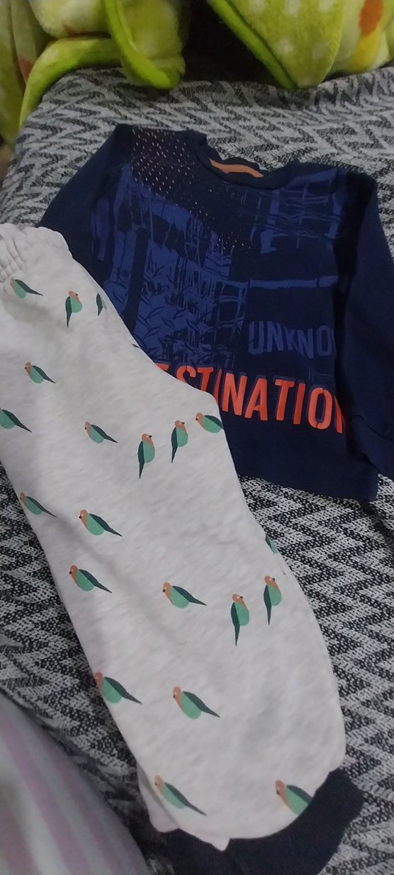 Baskılı uzun kollu, bisiklet yaka gri üst ve renkli kuş desenli pantolondan oluşan erkek bebek takımı. 1-2yaş için uygundur