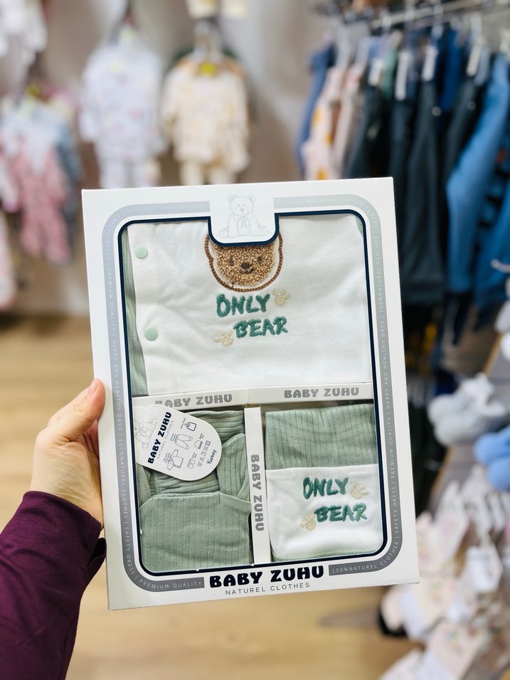 Gri ve khaki renklerde, "ONLY BEAR BABY ZUHU" yazılı baskılı beşli hastane çıkışı.yenidoğan